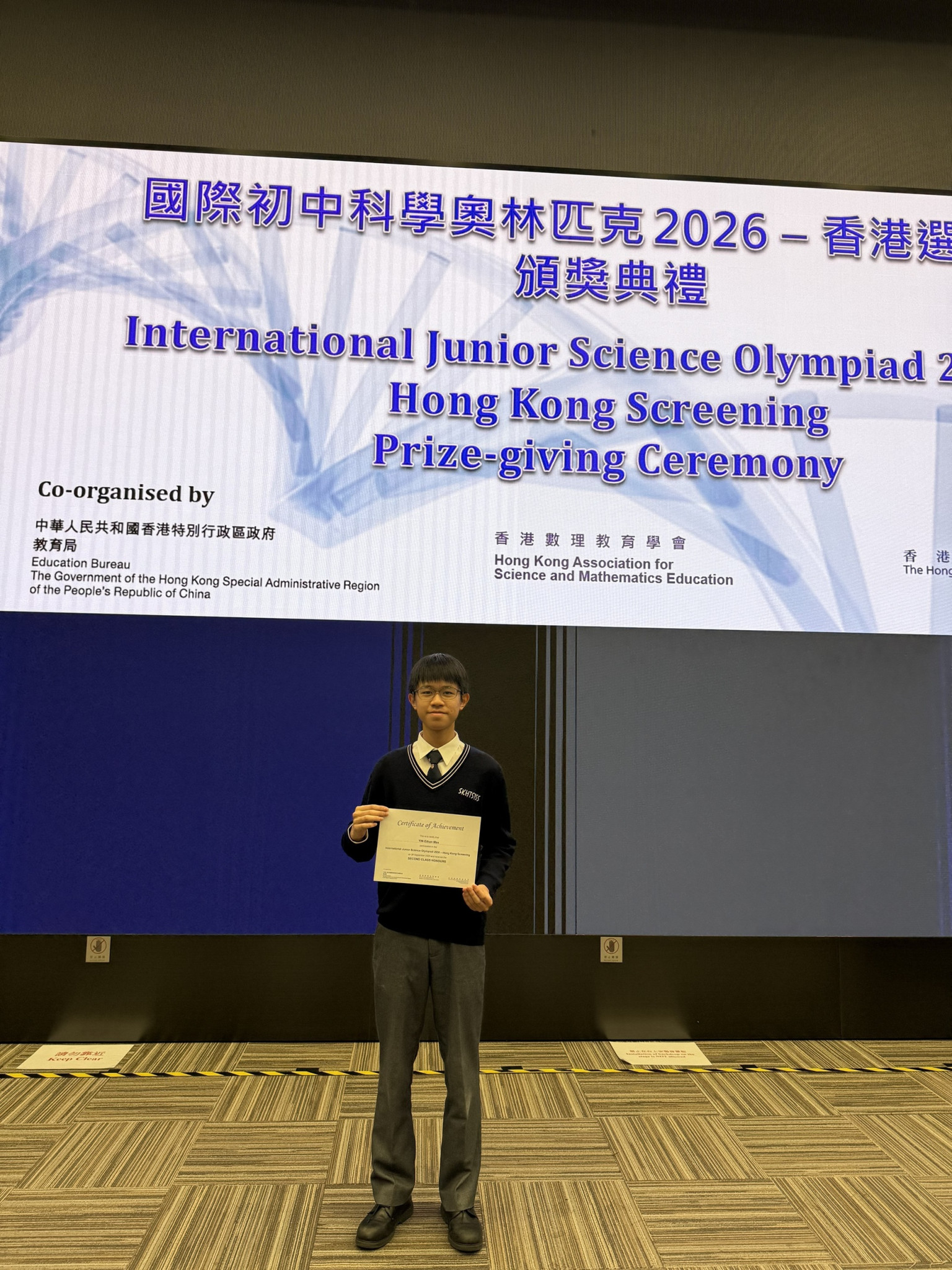 Congratulations to Yin Ethan Max from Class 3C on receiving the Second Class Honours in the International Junior Science Olympiad 2026 – Hong Kong Screening, held by the Hong Kong Academy for Gifted Education. He will be arranged to participate in a series of follow-on enhancement training programmes for the 23rd International Junior Science Olympiad.